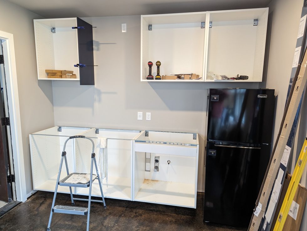 I finally got the time to make a big push on assembling and hanging the Ikea cabinets. Overall this went pretty smoothly, again thanks to the experience and know-how of my wife, and probably also because we had just assembled a ton of Ikea cabinets as part of our house remodel.
