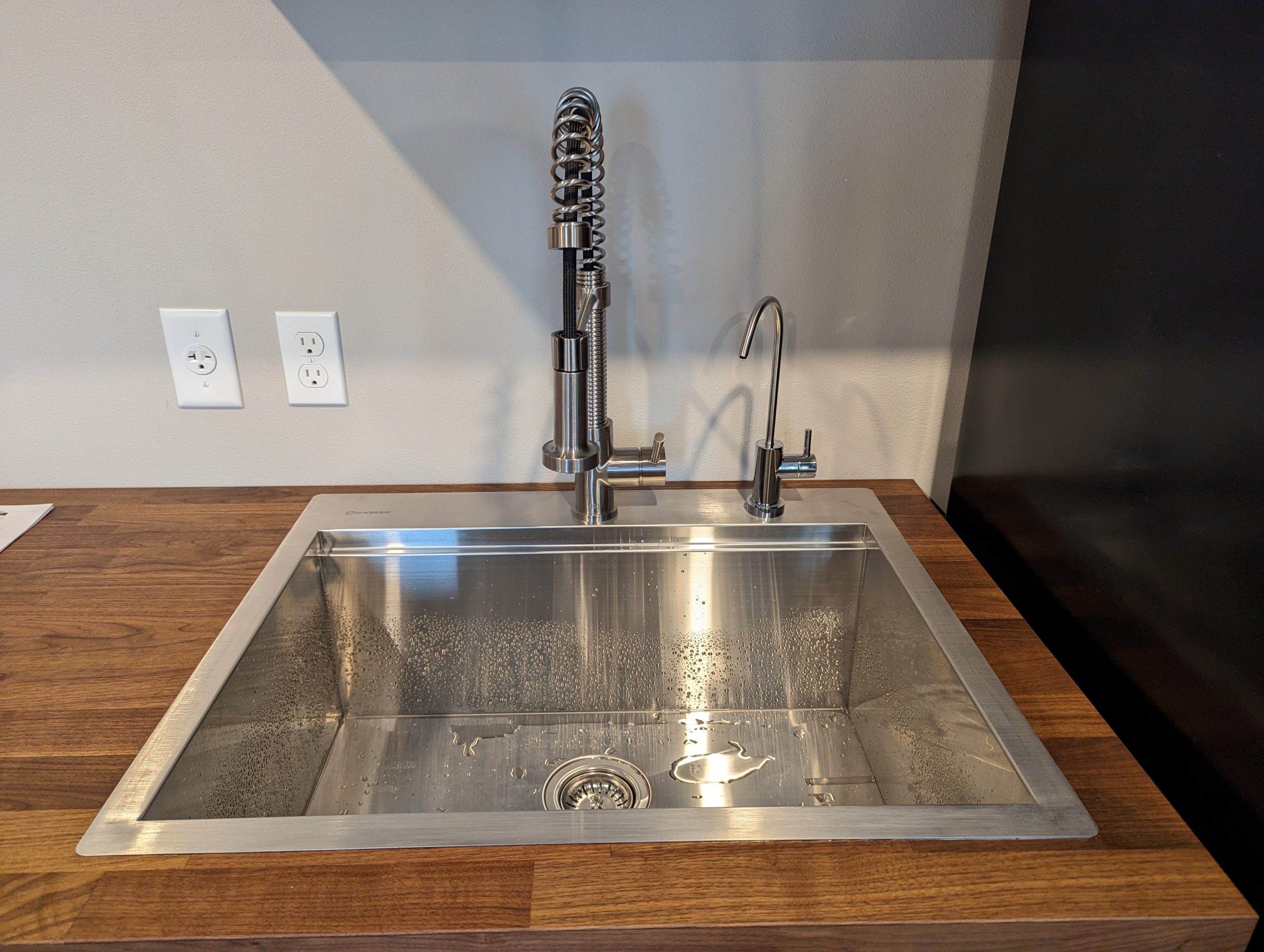 Quick update on the brewing space buildout progress -- the sink is in! My wife and I cut the hole in the countertop to drop in the sink, and then we could finally call the plumbers to come out and hook up everything including the Waterdrop RO filter and the under-sink hose bib for the wort chiller.