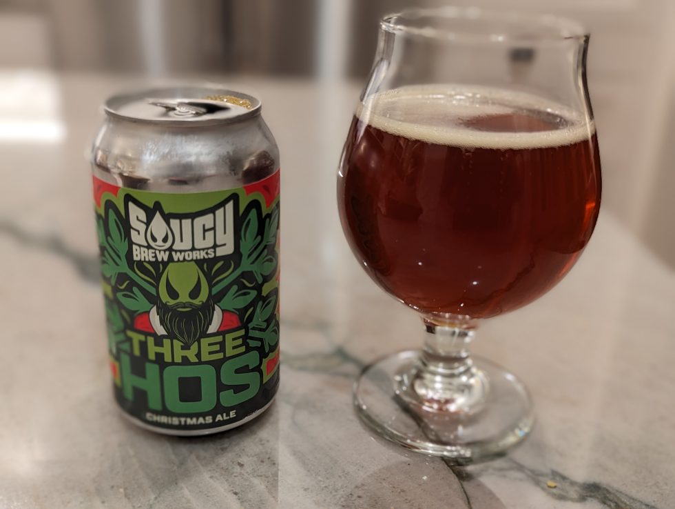 Tasting Saucy Brew Works' Three Hos Christmas Ale.