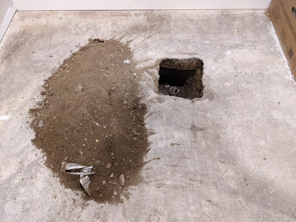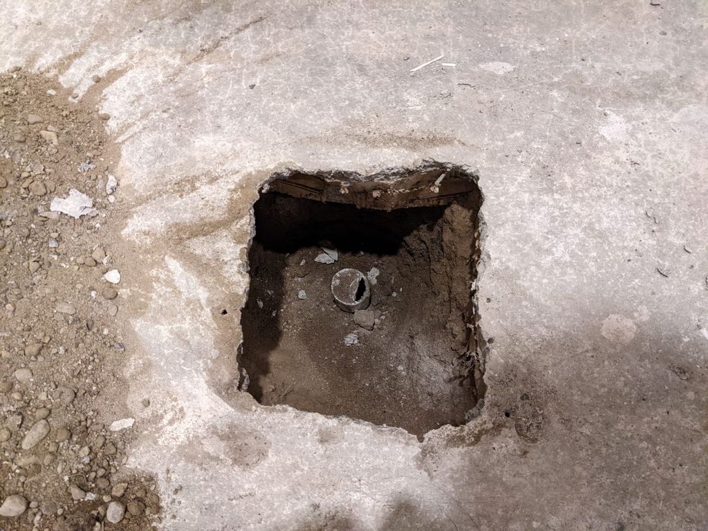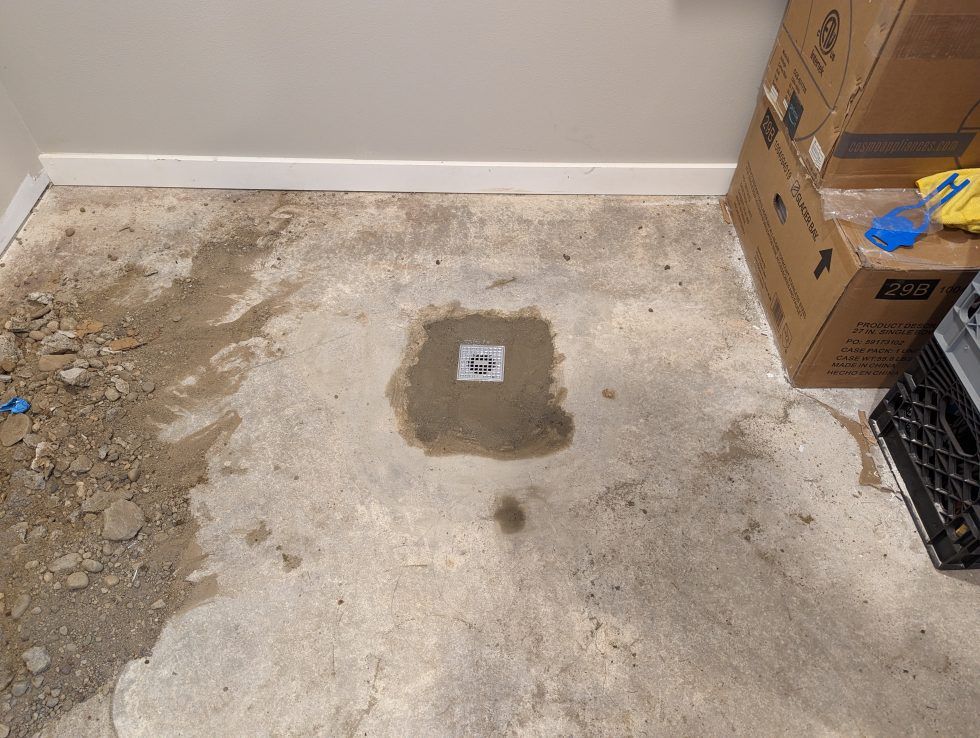 For reasons I won't go into the floor drain in the brewing space was initially covered by the slab, so it had to be chiseled out and filled in with concrete after the fact.
